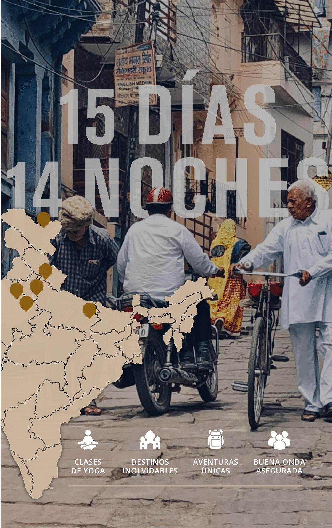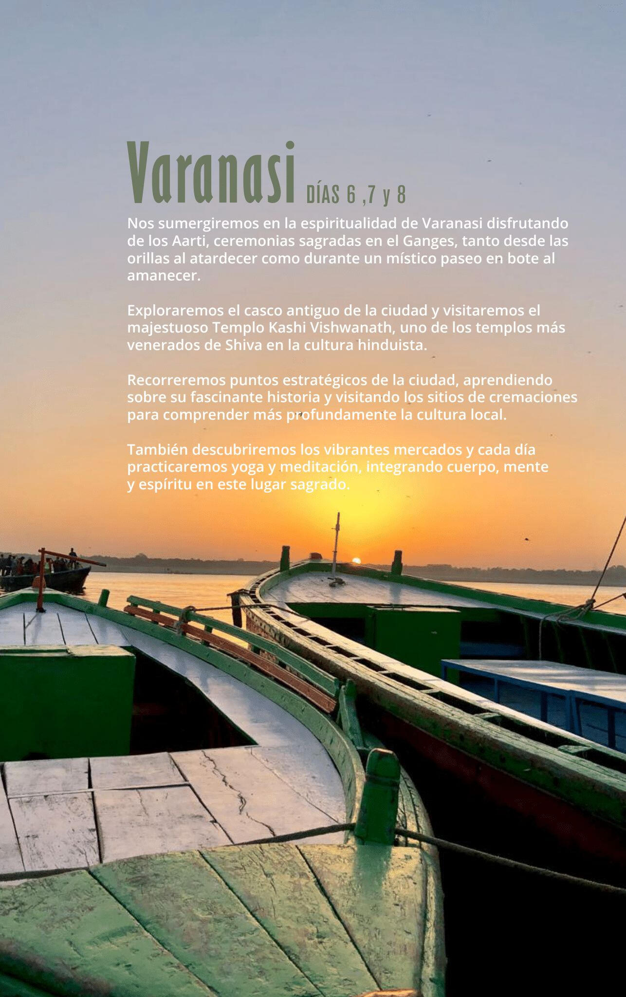 Un viaje de yoga y aventura cultural por los lugares más sagrados de India. Templos, mercados, amaneceres sobre el Ganges y práctica diaria en tierra de origen.