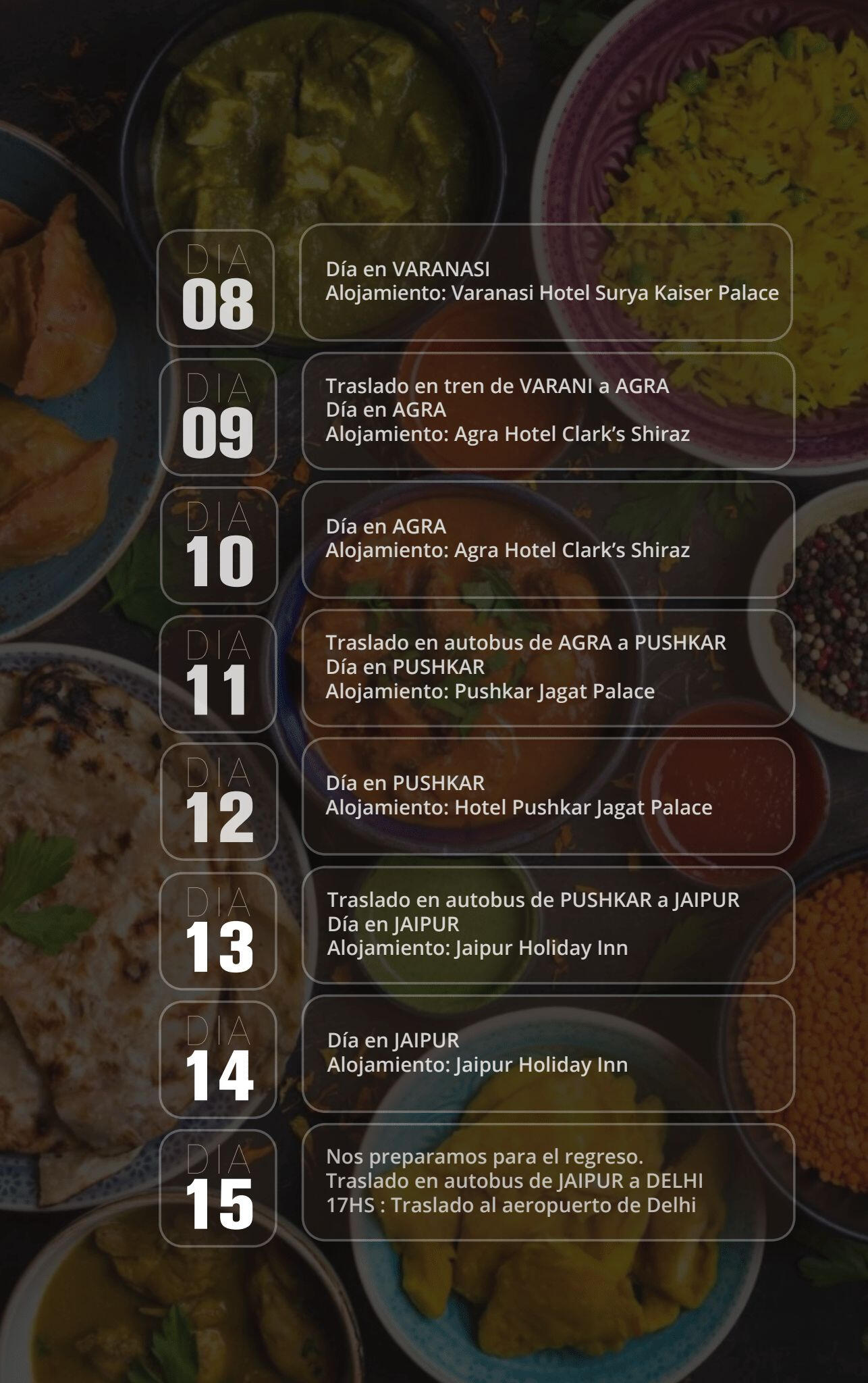 | Dias de viaje | Fecha de salida | destinos a conocer | Todos los dias |
